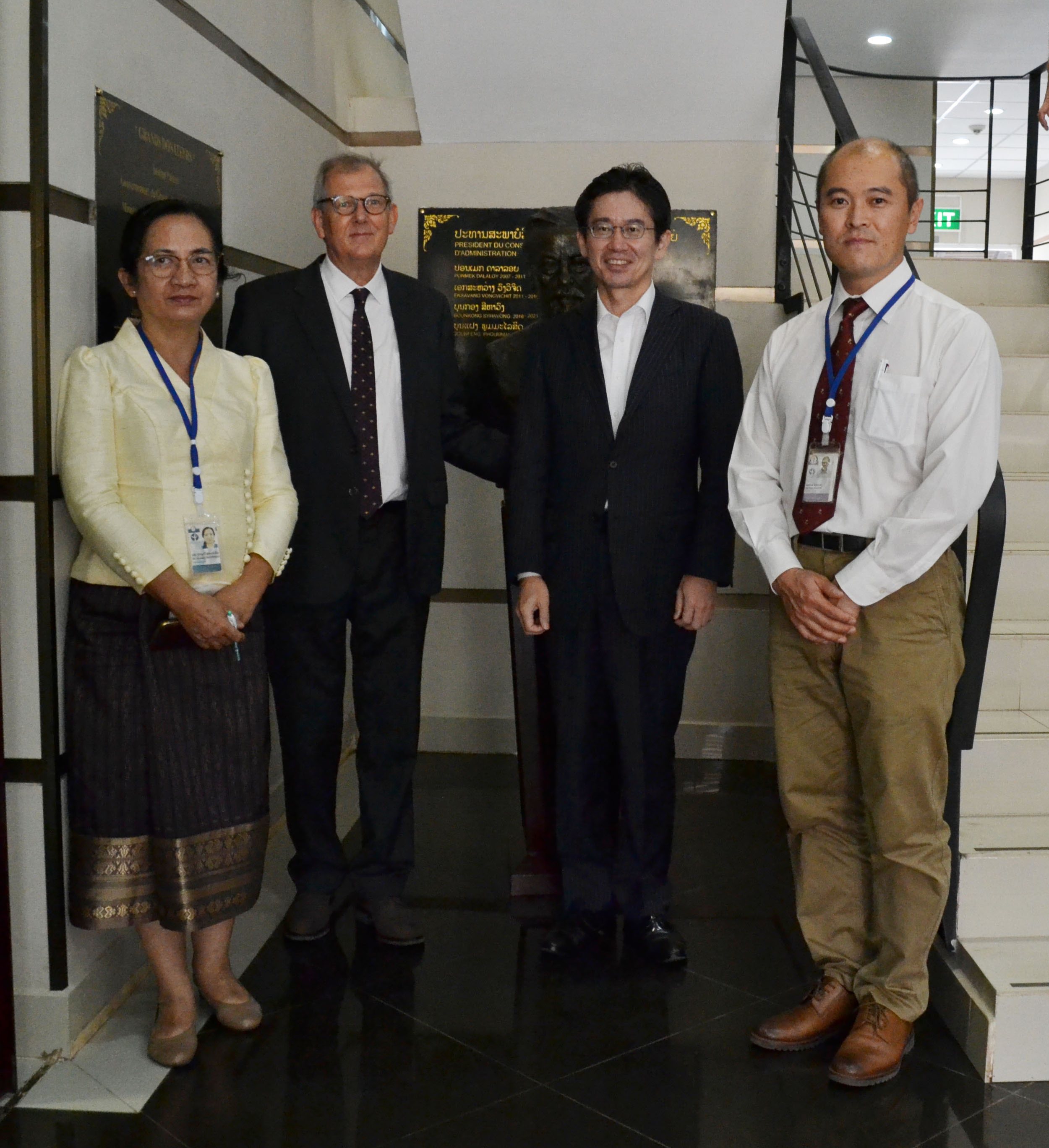 (写真下)JICAラオス事務所を表敬訪問しました。SATREPSのJICAプロジェクトも、Buchy新所長のマネージメントで8月に始まります。左から:長瀬利雄 JICAラオス事務所長、Buchy博士、石上室長、Brey IPL所長