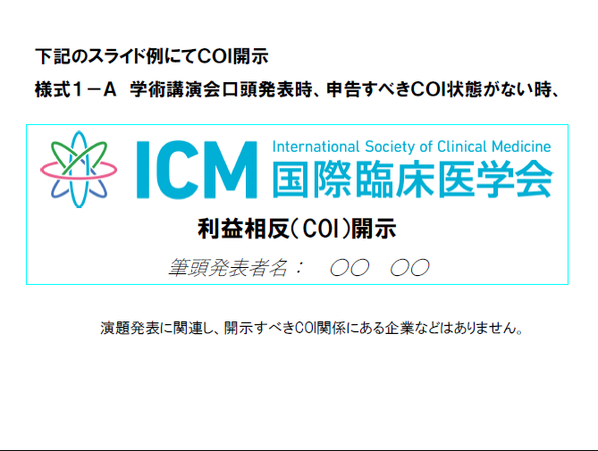 - 第6回国際臨床医学会学術集会におけるすべての発表者には、当学会の「利益相反に関する指針」に従い、演題発表時に利益相反状態の開示が必要となります。スライド2枚目に利益相反(COI)状態を記載し必ず開示してください。